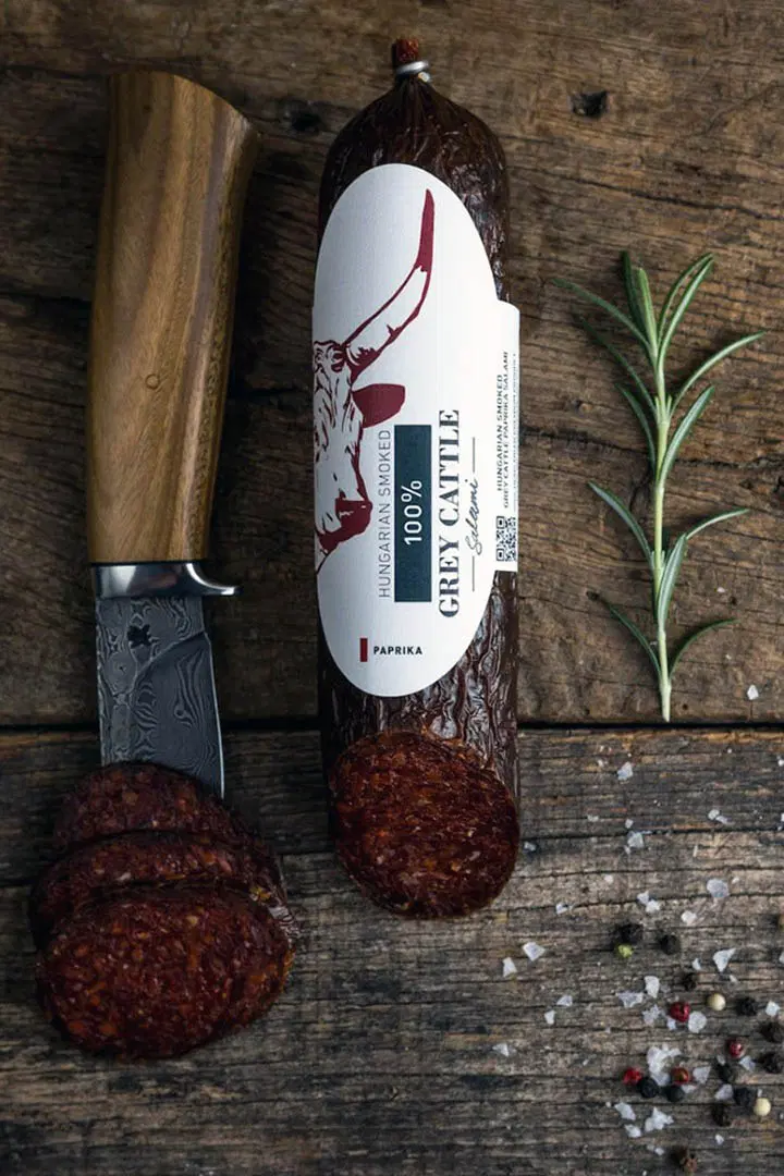 Die perfekte Kombination aus ungarischem rotem Paprika und Kümmel verleiht der Salami ihren Körper, die durch traditionelles Buchenholzräuchern und lange Reifung veredelt wird.