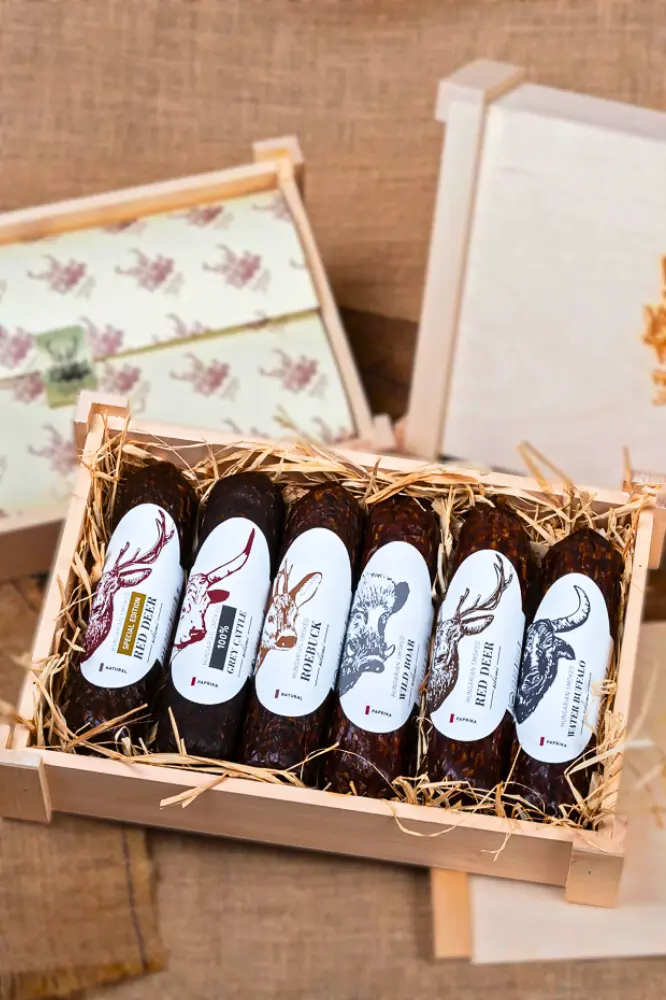 6 Stück Salami in einer exklusiven, handgefertigten, gravierten Holzkiste, in Venison-Gusto-Geschenkpapier und auf einem Bett aus Raffia, die sich auch hervorragend als repräsentatives Geschäftsgeschenk, Geburtstags- oder Namenstagsüberraschung eignet.