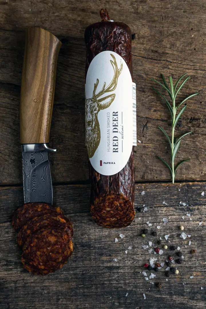Mit unserer Hirsch-Salami-Produktlinie folgen wir traditionellen ungarischen Rezepten, indem wir das Fleisch gesunder, wildlebender Tiere mit Schweinespeck verarbeiten – dadurch entfalten sich die Aromen der unter Flüssigstickstoff vermahlenen Premium-Gewürze noch intensiver.